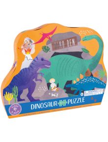 Цветна оранжева кутия за Пъзел Floss & Rock, Dino - Динозаври, 40 части - пъзел с динозаври, вулкан, дете и растения. Опаковката с уникална форма DINO DEN добавя допълнително забавление към играта!.