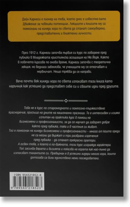 Вече почти век хиляди хора по света използват тази книга като наръчник как успешно да представят себе си и своите идеи пред другите. Това не е курс по старомодното и помпозно-тържествено красноречие, присъщо на дните на национални празници. То е интензивен и изцяло изпитан на практика курс в помощ на бизнесмени и професионалисти, за да се научат да говорят добре както пред публика, така и в частния си живот.