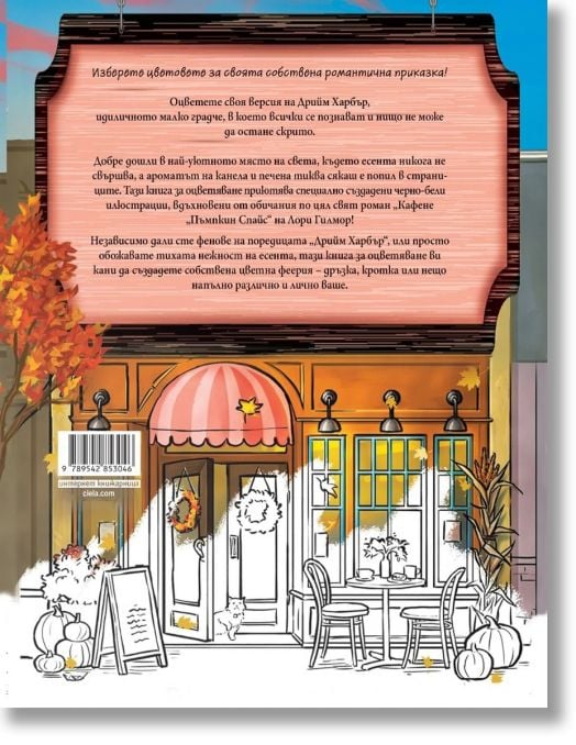 Добре дошли в най-уютното място на света, където есента никога не свършва, а ароматът на канела и печена тиква сякаш е попил в страниците. Тази книга за оцветяване приютява специално създадени черно-бели илюстрации, вдъхновени от обичания по цял свят роман „Кафене „Пъмпкин Спайс“ на Лори Гилмор!