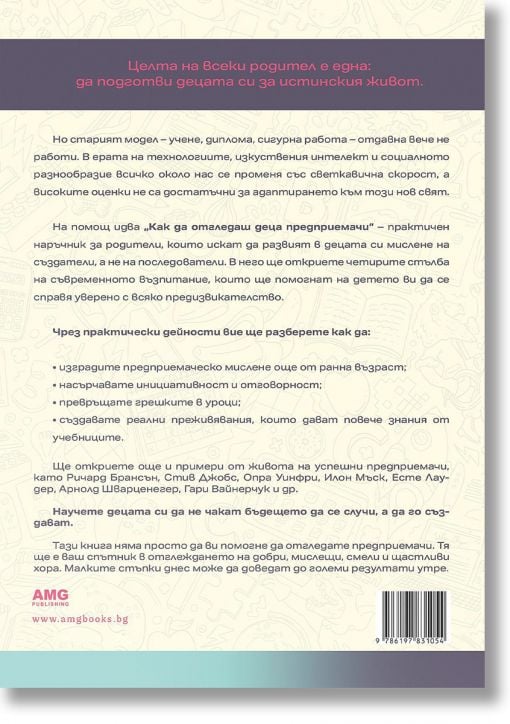 Тази книга няма просто да ви помогне да отгледате предприемачи. Тя ще е ваш спътник в отглеждането на добри, мислещи, смели и щастливи хора. Малките стъпки днес може да доведат до големи резултати утре.