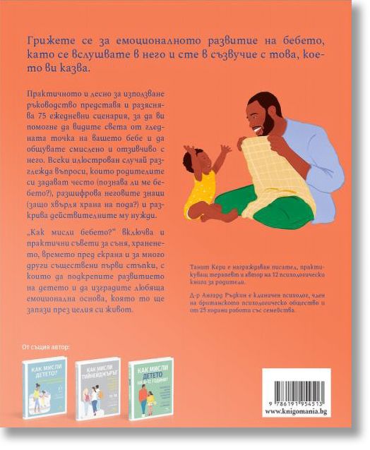 „Как мисли бебето?“ включва и практични съвети за съня, храненето, времето пред екрана и за много други съществени първи стъпки, с които да подкрепите развитието на детето и да изградите любяща емоционална основа, която то ще запази през целия си живот.