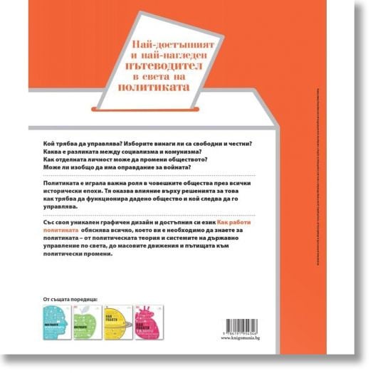 Със своя уникален графичен дизайн и достъпния си език „Как работи политиката” обяснява всичко, което ви е необходимо да знаете за политиката – от политическата теория и системите на държавно управление по света, до масовите движения и пътищата към политически промени.