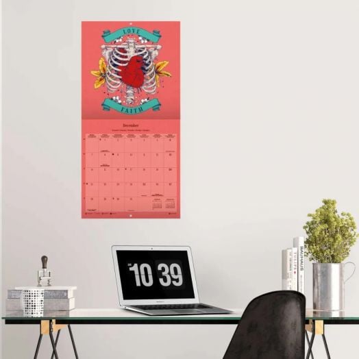 Календарът има дупка за закачване на стена, както място за водене на бележки за всеки ден.