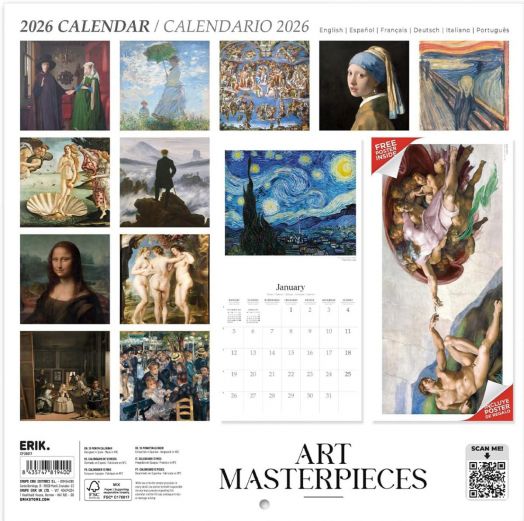 12 различни пълноцветни изображения с размери 30 x 30 см. Разгънат, календарът е с размери приблизително 30 x 60 см.