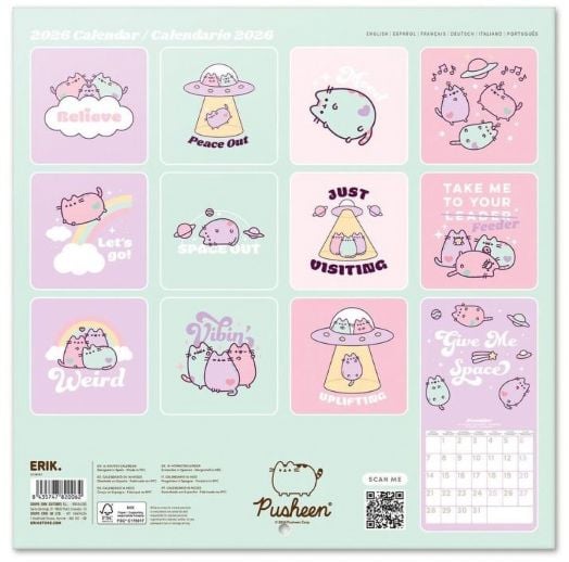 Вертикален стенен календар за 2026 година, вдъхновен от най-известната котка в интернет Pusheen и с който можете да следете, за да не пропуснете вашите срещи, семейни и лични ангажименти и социални планове през годината.