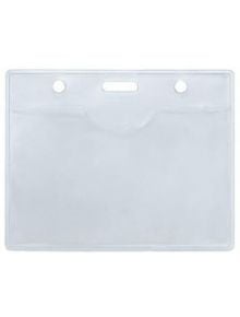 Хоризонтален джоб за бадж Spree, 96 x 76 мм, от прозрачен PVC с два кръгли отвора и един правоъгълен слот отгоре; държачът е празен и правоъгълен.
