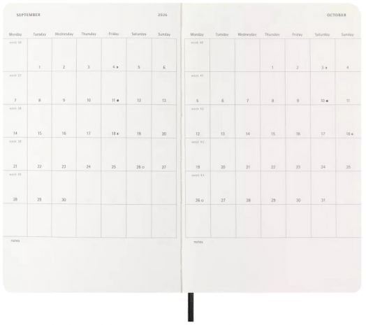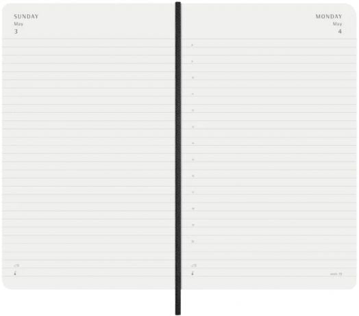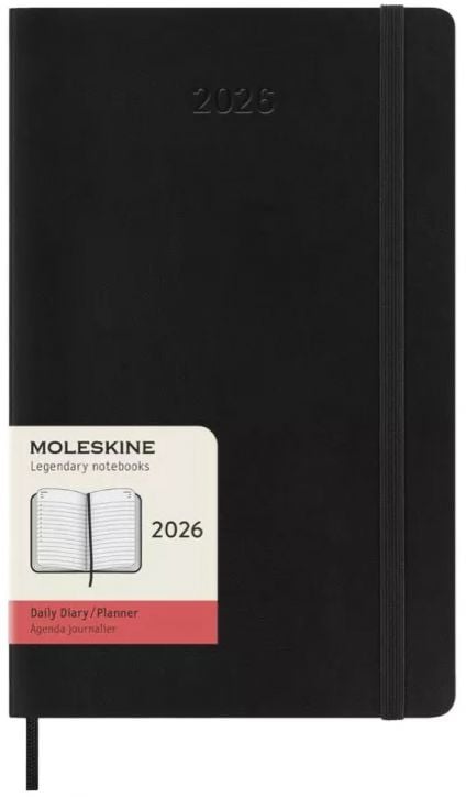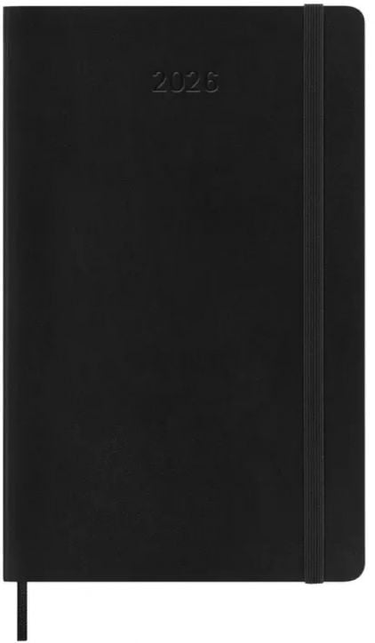 Класически черен дневен тефтер - органайзер Moleskine Black за 2026 година с меки корици, линирани страници широки редове в класически формат 13 х 21 см. и удобна и еластична лента, която да държи бележките ви подредени.