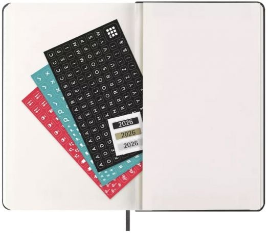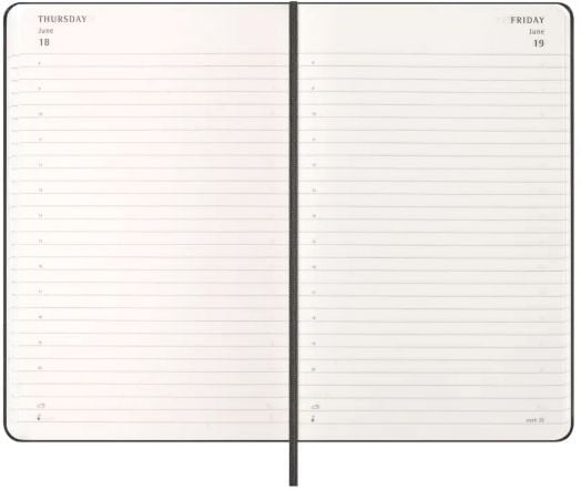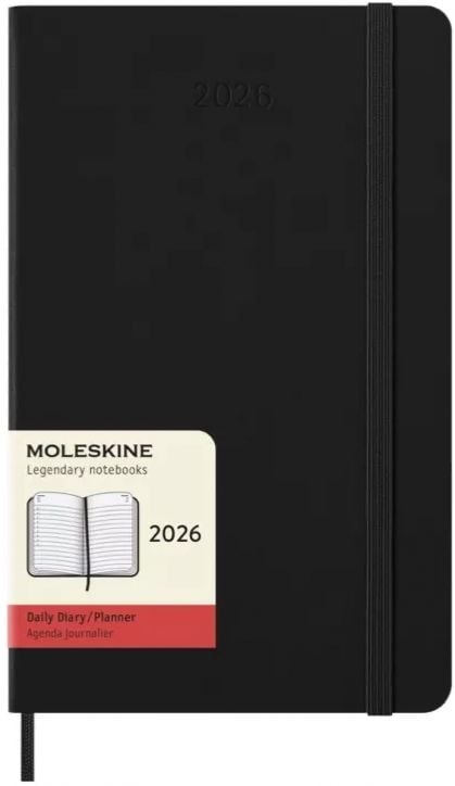 Класически черен дневен тефтер - органайзер Moleskine Black за 2026 година с твърди корици, линирани страници широки редове в класически формат 13 х 21 см. и удобна и еластична лента, която да държи бележките ви подредени.