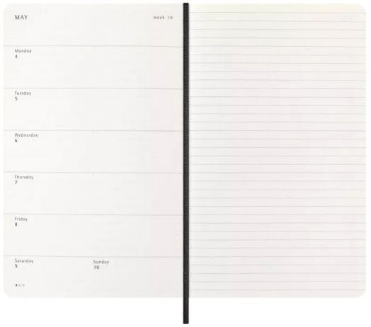 Организирането на дните от седмицата е на лявата страница в хоризонтален изглед, а дясна страница е линирана - с широки редове, което я прави подходяща за бележки и коментари.