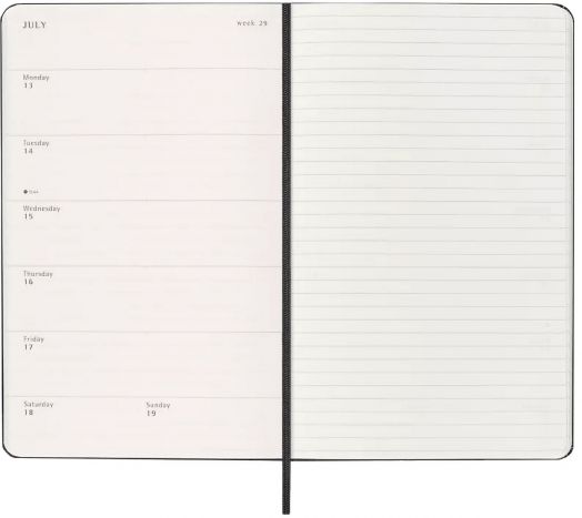 Организирането на дните от седмицата е на лявата страница в хоризонтален изглед, а дясна страница е линирана - с широки редове, което я прави подходяща за бележки и коментари.