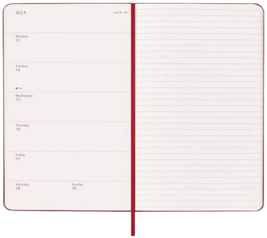 Организирането на дните от седмицата е на лявата страница в хоризонтален изглед, а дясна страница е линирана - с широки редове, което я прави подходяща за бележки и коментари.