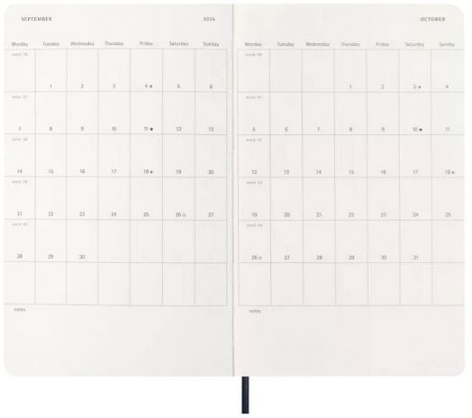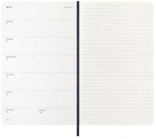 Организирането на дните от седмицата е на лявата страница в хоризонтален изглед, а дясна страница е линирана - с широки редове, което я прави подходяща за бележки и коментари.