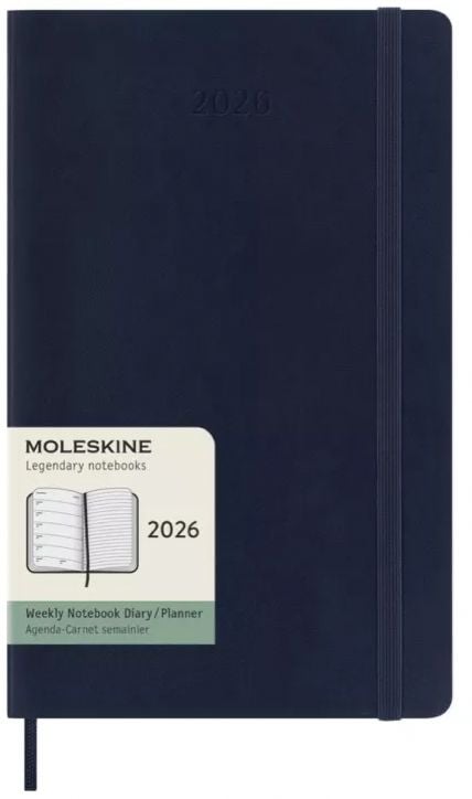 Класически син седмичен тефтер - органайзер Moleskine Sapphire Blue за 2026 година с меки корици.