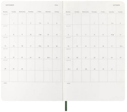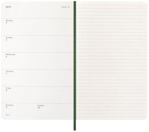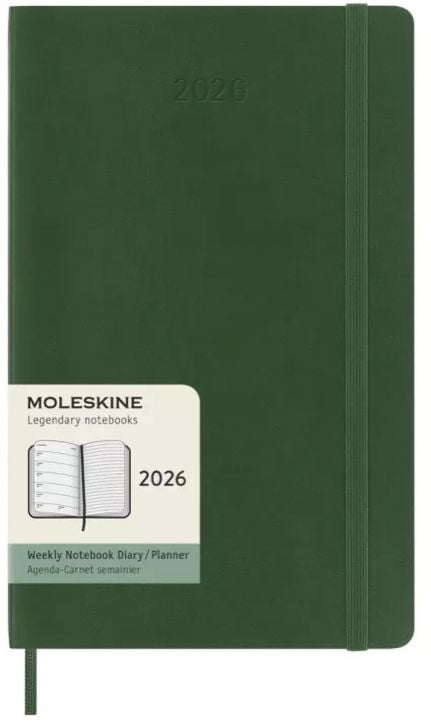 Класически зелен седмичен тефтер - органайзер Moleskine Myrtle Green за 2026 година с меки корици.
