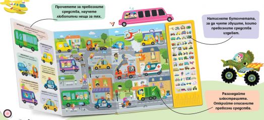 С едно натискане на бутона малките читатели могат да чуят повече от 50 реалистични звука – от мощното боботене на двигатели до тракането и бръмченето на различни машини. Книгата насърчава любопитството, развива слуховото възприятие и помага на децата да свързват образите със звуците.