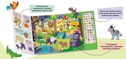 С натискане на бутоните малките изследователи могат да чуят повече от 50 реалистични животински звука – от мощното ръмжене на диви животни до крякането, цвърченето и други характерни гласове от природата.