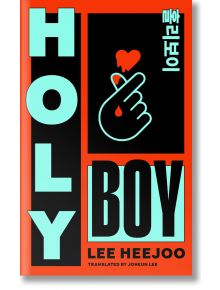 Корицата на книгата Holy Boy е със смел тюркоазен и черен текст върху оранжево, ръка, която прави сърце с пръсти, обсипано с червен, видим корейски текст и дизайн, напомнящ за корейски литературен трилър.