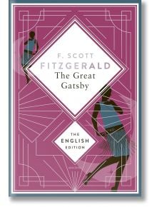 Корица на книгата "Великият Гетсби" (Анаконда) с дизайн в стил ар деко с геометрични линии и две жени в рокли на флейпърки от 20-те години на миналия век, напомнящи за ревящите 20-те години, на наситен лилав фон.