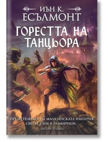 Далхонски маг с качулка и зелено наметало стои готов на покрив през нощта сред сенки. Средновековни кули се издигат в мъгла. Български текст и заглавие "Горестта на танцьора - мека корица - книга 1" се наслагват върху тази драматична фантастична сцена.