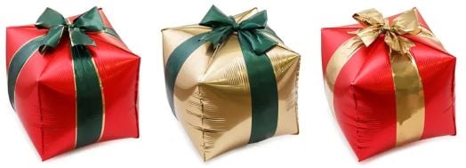 Комплект от три фолиеви балона във формата на разноцветни коледни подаръци.