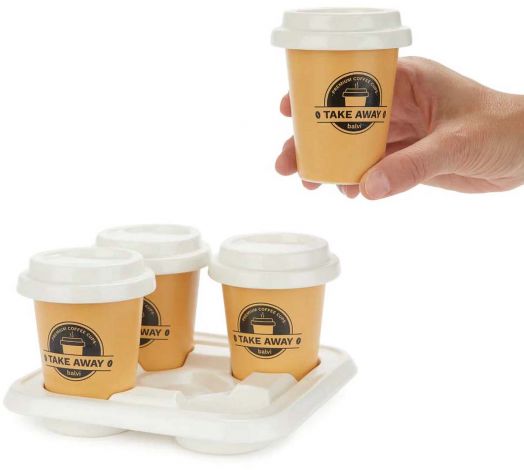Комплектът включва 1 подложка (тава) и 4 чаши за кафе, всяка с декоративен капак.