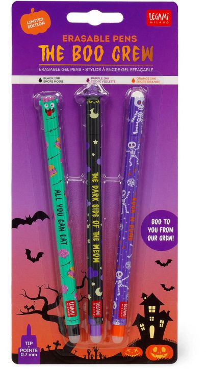 Виж го с очите си... или пък не! Комплектът от 3 изтриваеми гел химикалки The Boo Crew на Legami ще ти даде ново значение на „писане с духове“. Не се притеснявай за грешки в бележките си – термосензорното мастило може да бъде изтрито с помощта на заобления край на химикалката.