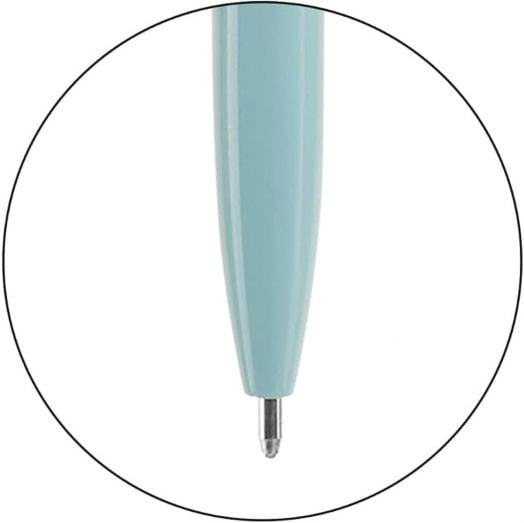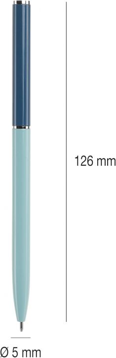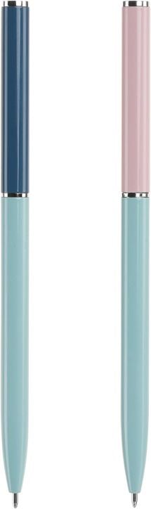 Корпусът на химикалката е метален, но леко едновременно елегантен, лек и тънък в два цвята: долната част/половина и на двете е в светлосин цвят, а в горната - на едната е в пастелно петроленосиньо, а на другата - в светлорозов цвят.