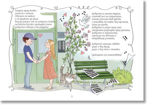 Книгата съдържа съвременна история за любовта и приятелството, разказана през погледа на един необикновен уличен котарак. Среща ни с неизбежните изпитания, които можем да преодолеем с разбиране, търпение и прощаване, защото никой не е идеален, всички понякога грешим.
