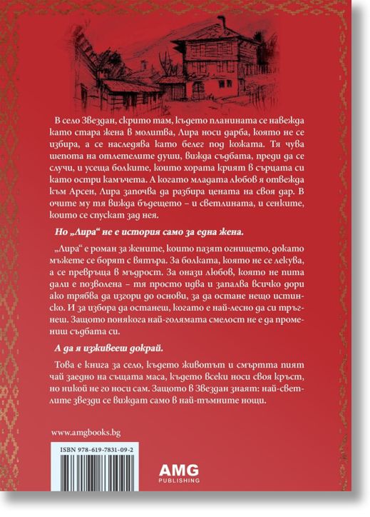 В село Звездан, скрито там, където планината се навежда като стара жена в молитва, Лира носи дарба, която не се избира, а се наследява като белег под кожата. Тя чува шепота на отлетелите души, вижда съдбата, преди да се случи, и усеща болките, които хората крият в сърцата си като остри камъчета. А когато младата любов я отвежда към Арсен, Лира започва да разбира цената на своя дар. В очите му тя вижда бъдещето – и светлината, и сенките, които се спускат зад нея.