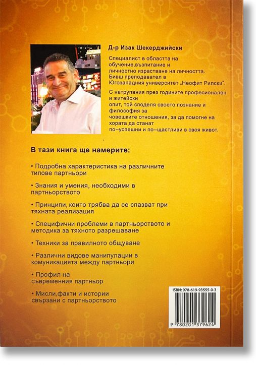 В тази книга ще намерите подробна характеристика на различните типове партньори, знания и умения, необходими в партньорството, прин.ципи, които трябва да се спазват при тяхната реализация, специфични проблеми в партньорството и методика за тяхното разрешаване, техники за правилното общуване, различни видове манитулации в комуникацията между партньори, профил на съвреименния партньор, мисли и факти и истории, свързани с партньорството.