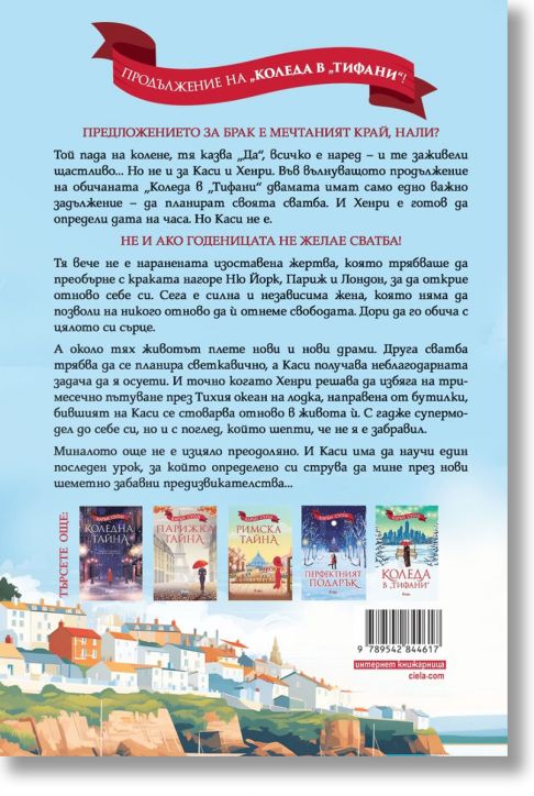 Той пада на колене, тя казва „Да“, всичко е наред – и те заживели щастливо… Но не и за Каси и Хенри. Във вълнуващото продължение на обичаната „Коледа в „Тифани“ двамата имат само едно важно задължение – да планират своята сватба. И Хенри е готов да определи дата на мига. Но Каси не е.