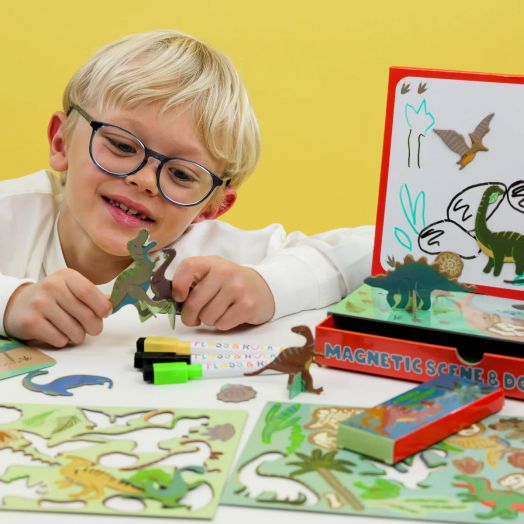 Този комплект съчетава магнити и рисуване в едно, като предлага безкрайни възможности за творчески истории и забавна игра.