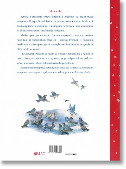 Малко преди да настъпи светлият празник, старите камбани започват да упражняват гласа си – бим-бам-бумммм. И подканят малката си посестрима да ги последва. Ала камбанката не издава ни звук.