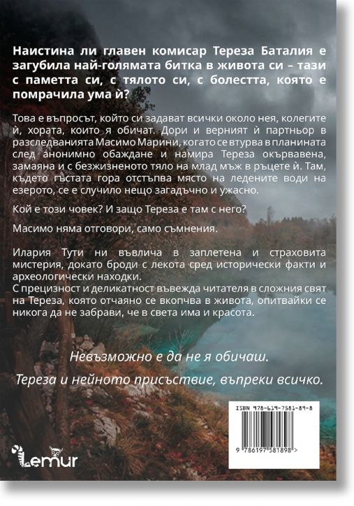 Това е въпросът, който си задават всички около нея, колегите й, хората, която я обичат. Дори и верният й партньор в разследванията Масимо Марини, когато се втурва в планината след анонимно обаждане и намира Тереза окървавена, замаяна и с безжизненото тяло на млад мъж в ръцете й. Там, където гъстата гора отстъпва място на ледените води на езерото, се е случило нещо загадъчно и ужасно.