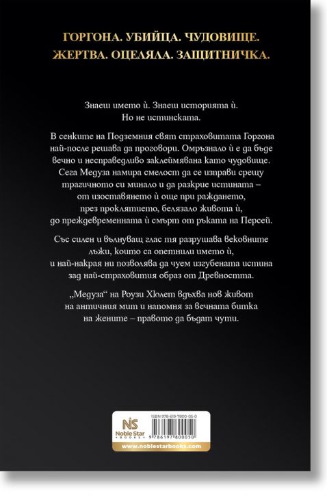 Много уважавани романисти се заемат с гръцките легенди и ги преразказват от гледната точка на жените, но тази книга безспорно изпъква като една от най-добрите. Това е забележителен преразказ на историята за Медуза, която винаги е била изобразявана с коса от извиващи се, шепнещи змии – зъл чудовищен образ, превръщащ в камък всеки, който я погледне в очите. Трудно е да си представим как бихме могли някога да видим Медуза в по-съчувствена светлина, и все пак Роузи Хюлет успява именно в това – с глас, който говори на съвременния свят с изненадваща актуалност.