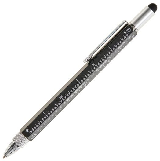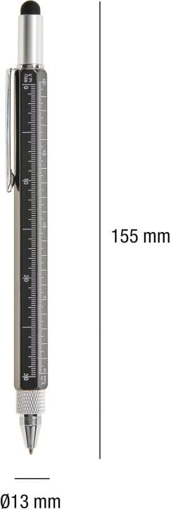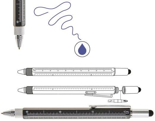 Тази химикалка съдържа в себе си още няколко полезни инстументи - архитектурна линийка както в сантиметри и инчове, стилус за сензорен екран, мини отвертка Phillips и вграден нивелир.
