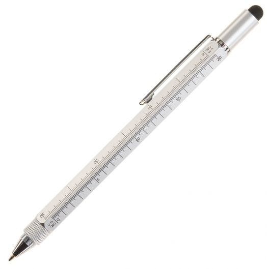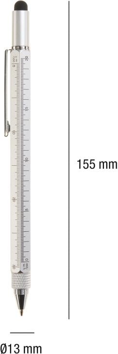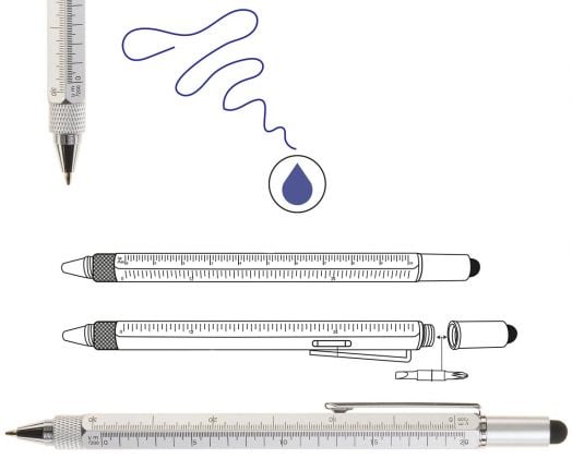 Тази химикалка съдържа в себе си още няколко полезни инстументи - архитектурна линийка както в сантиметри и инчове, стилус за сензорен екран, мини отвертка Phillips и вграден нивелир.
