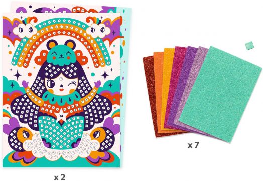 Съдържа 2 картини за завършване, 7 листа с цветни квадратчета и книжка с инструкции.
