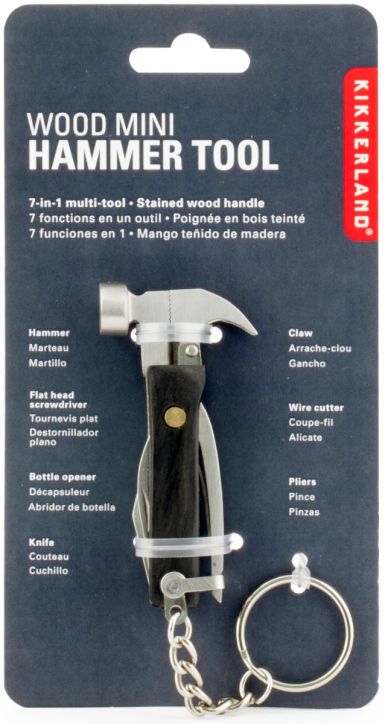 Този инструмент с дървена дръжка съдържа нож, чук, клещи, отварачка за бутилки, плоска отвертка, клещи, резачка за тел.