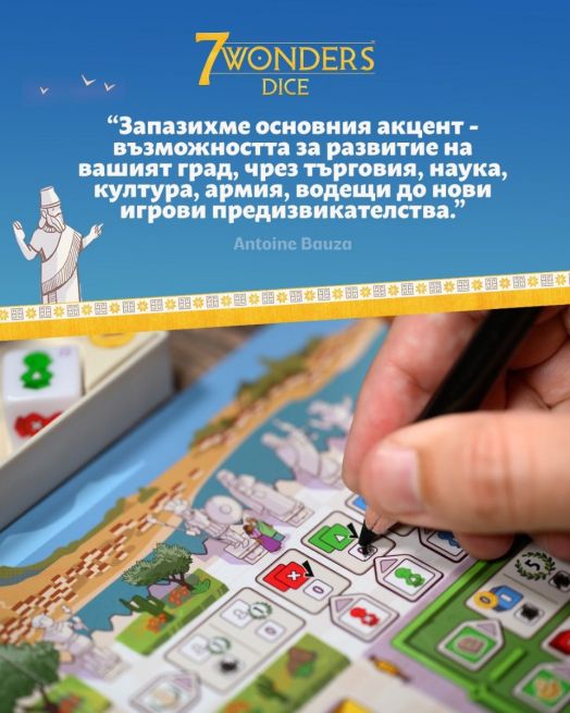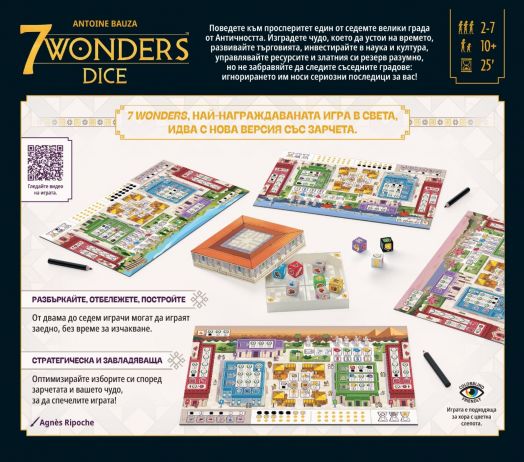 Идеална за фенове на стратегическите игри и на класическата 7 Wonders, тази версия със зарове предлага бърз, динамичен и вълнуващ начин да се потопите в древния свят!