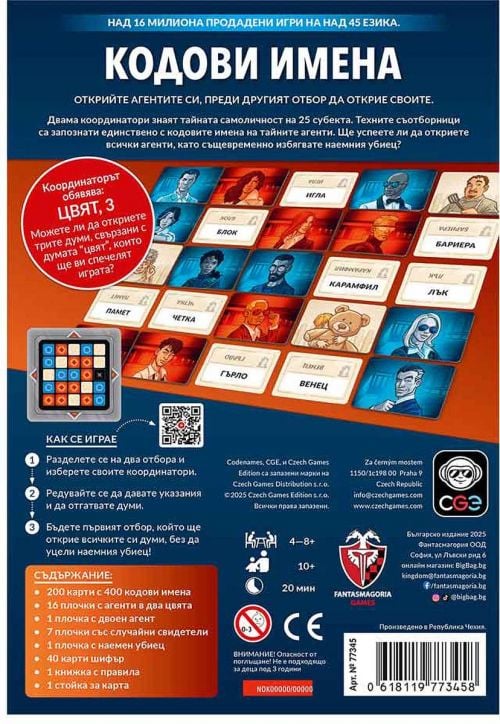 Двама координатори знаят тайната самоличност на 25 субекта. Техните съотборници са запознати единствено с кодовите имена на тайните агенти. Двата отбора се състезават кой първи ще осъществи контакт със своите тайни агенти. Координаторите дават указания, състоящи се от една дума, които може да водят до една или няколко от картите на игралното поле. Техните съотборници се опитват да разкрият самоличността на своите агенти, като се стараят да избегнат сблъсъка с чужди шпиони. Същевременно, всички се стремят да избегнат убиеца. Кодови имена: печелите или губите, забавлението е в това да разгадаете уликите!