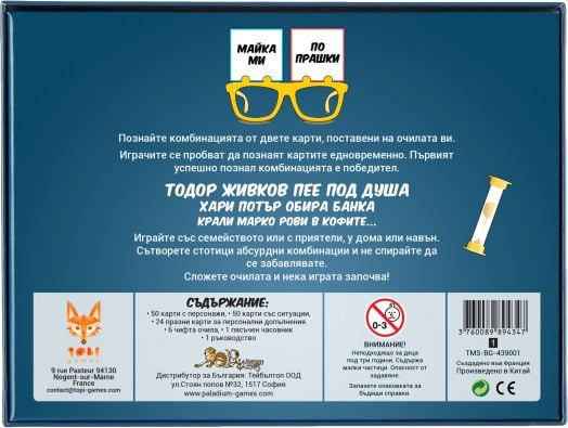 Играта предлага богат набор от комични съчетания между различни личности и ситуации. Комбинирайте картите „Личност“ и „Ситуация“, за да създавате нови, забавни моменти при всяка игра. Първият играч, който познае собствената си комбинация от картите на очилата, печели рунда.