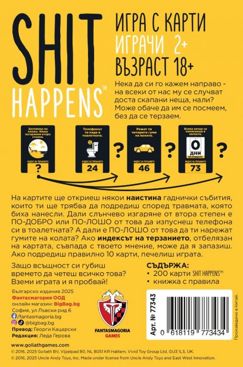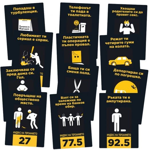 В тази игра ще откриете карти с различни „гадни“ ситуации, които трябва да подредите според това колко неприятни биха били за вас. По-добре ли е да получиш слънчево изгаряне от втора степен или да изпуснеш телефона си в тоалетната? А къде стои това в сравнение с нарязани автомобилни гуми? Ако вашата преценка съвпадне с отбелязания на картата индекс на терзанието, можете да я запазите. Подредете правилно 10 карти и печелите играта.