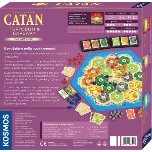 Третото разширение на хитовата игра Катан ни донася нови приключения и предизвикателства - открийте злато в реките, търгувайте с прясно уловената риба и бранете бреговете си от набезите на варварите!