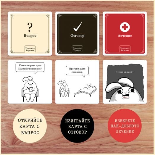 Как протича играта: играчите се редуват да бъдат Терапевти. Терапевтът тегли карта Въпрос, след което изиграва карта Отговор. Останалите участници избират от ръката си карта Лечение. Без да знае чия е коя, Терапевтът избира тази, която му харесва най-много. Собственикът на избраната карта печели една точка. Първият, който събере три точки, става победител.
