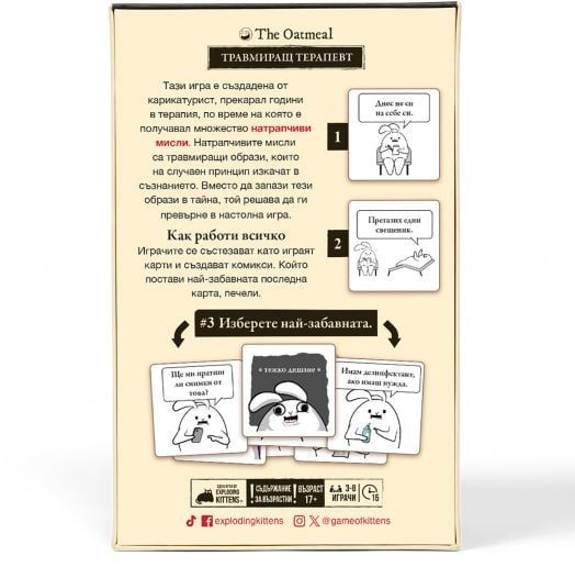 Играта е изключително лесна. Заедно с приятелите си трябва да създадете комикс от три части. Очаквайте много смях, изненади и малко потрес. Някой може да се (леко) засегне, но накрая всички ще се забавляват истински. Доверете се на своите „натрапчиви мисли“ – те може да ви отведат до победата!