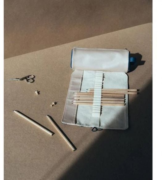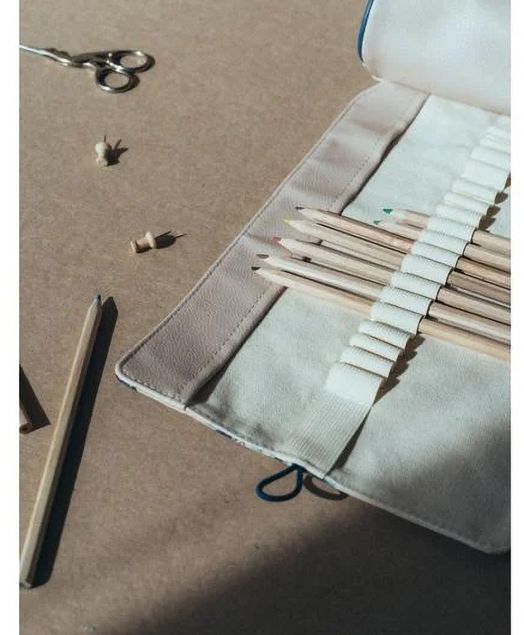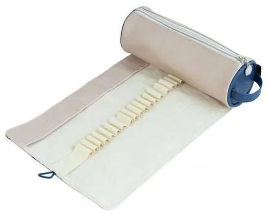 Когато не се използва, несесерът се навива на руло и се затваря с еластична лента и копче, което го прави компактен, преносим и идеален за пътуване, училище или арт студио.