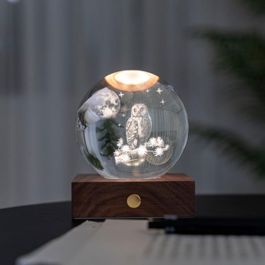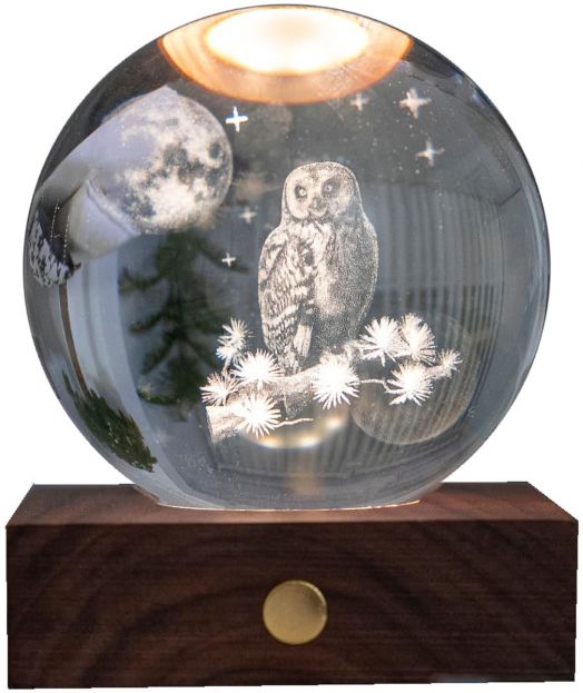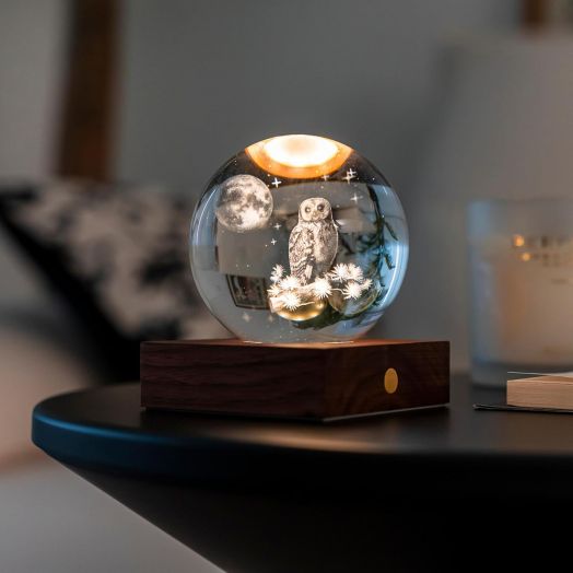 С височина 12 см кристалната топка е разположена върху основа от естествено орехово дърво, за да допълни интериорния ви дизайн. Можете да превключвате между три нива на интензивност на светлината, като докоснете медния бутон отпред на основата от масивна естествена дървесина. Кристалът също е полиран до блясък, който отразява светлината и създава зашеметяващ ефект във всяка стая. Основата от орех е снабдена с акумулаторна батерия, която може да поддържа пространството ви осветено със зашеметяваща светлина до 16 часа. USB-C портът в задната част позволява лесно зареждане.