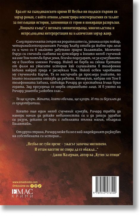 Кралят на скандинавското крими Ю Несбьо ни поднася първия си хорър роман, с който отново демонстрира неизчерпаемия си талант за поглъщащи истории, запомнящи се герои и шокиращи развръзки. „Нощната къща“ е неговата хипнотизираща, многопластова и непредвидима интерпретация на класическия хорър жанр.