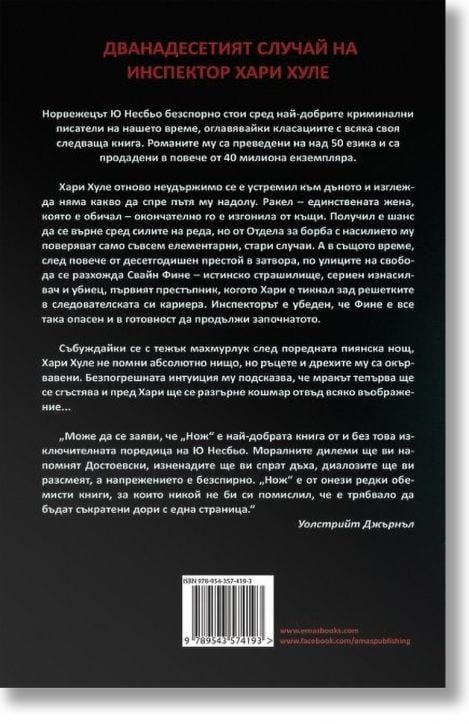 „Може да се заяви, че „Нож“ е най-добрата книга от и без това изключителната поредица на Ю Несбьо. Моралните дилеми ще ви напомнят Достоевски, изненадите ще ви спрат дъха, диалозите ще ви разсмеят, а напрежението е безспирно. „Нож“ е от онези редки обемисти книги, за които никой не би си помислил, че е трябвало да бъдат съкратени дори с една страница.“ Уолстрийт Джърнъл